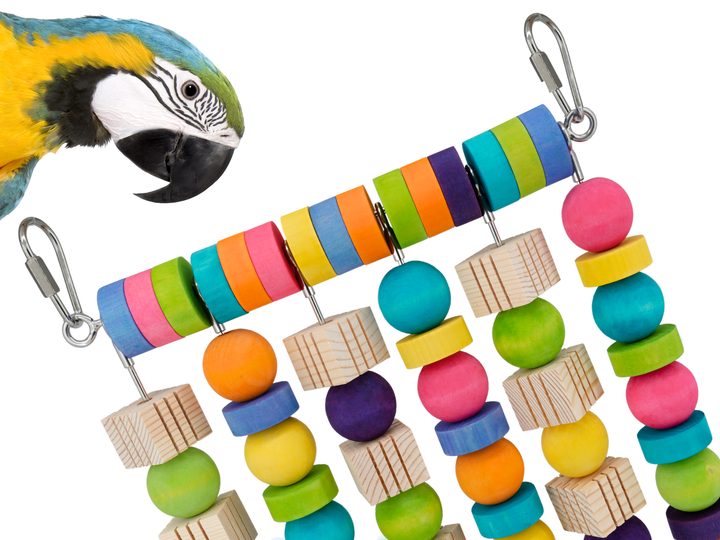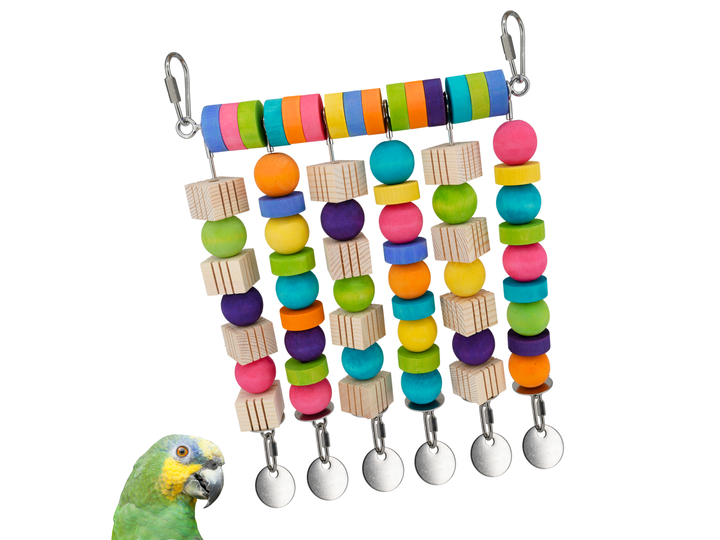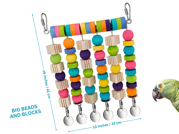The larger-sized beads and blocks on this Jangly Wall of Toys™ may make this toy a better option for bigger birds with strong beaks.