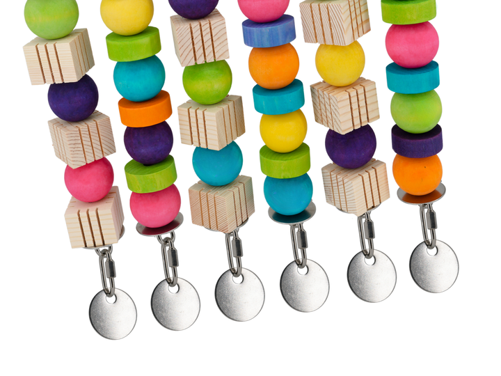 This extra-large Jangly Wall of Toys™ is specially designed for our BIGGER feathered beauties who are fond of LARGER beads and blocks. This refillable stainless steel bird toy platform comes pre-loaded with: