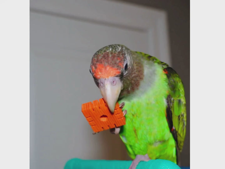 These beautiful all natural grooved blocks are great for making bird toys and are perfect for our refillable toy structures. They make nice foot toys for medium and large birds as illustrated by our lovely Lola.
